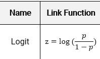 – A logit link function takes values between 0 and 1 and maps it to a value between \(-\infty\) and \(\infty\)