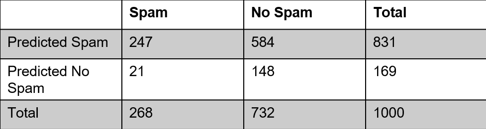 – Given that the email was actually spam, what is the probability that our model predicted the email to be spam? (Sensitivity)